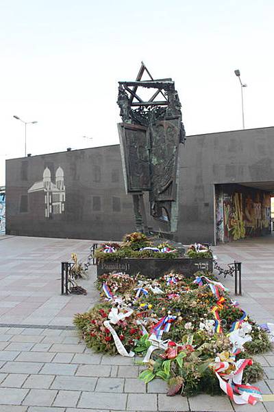 位於漁業廣場上的猶太人紀念碑,原址是座猶太教堂,1970年,因興建新橋,不顧當地居民反對將其拆除。紀念碑後方牆上(左),畫的便是當時的猶太教堂。紀念碑由Milan Lukáč作於1996年。