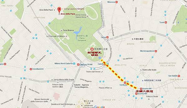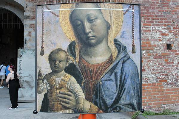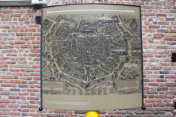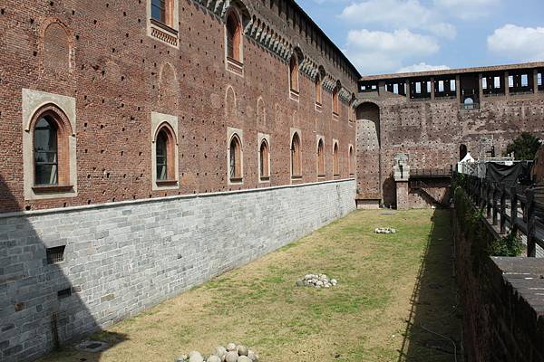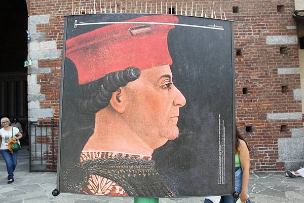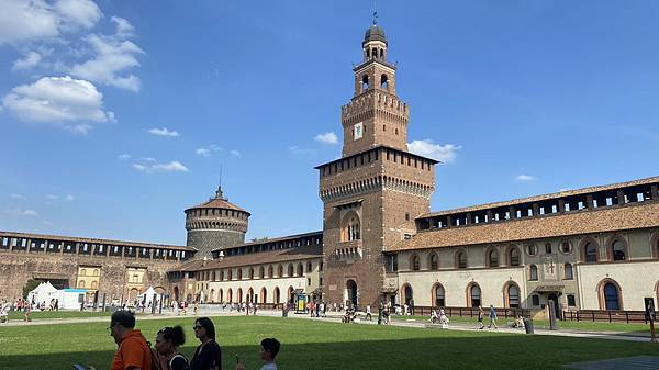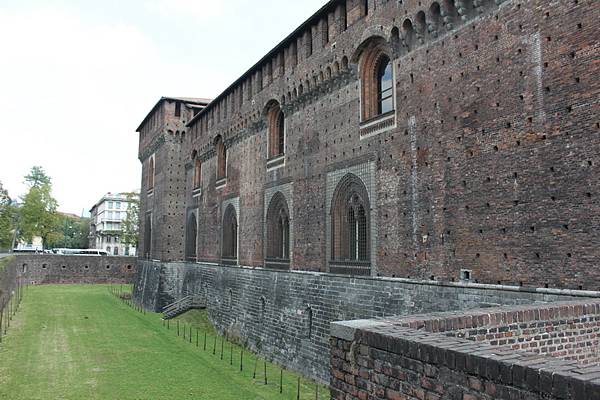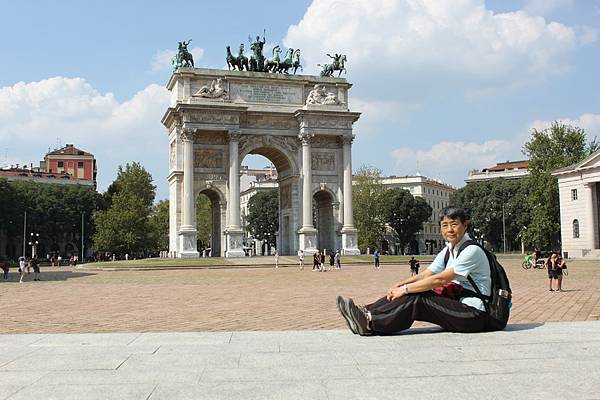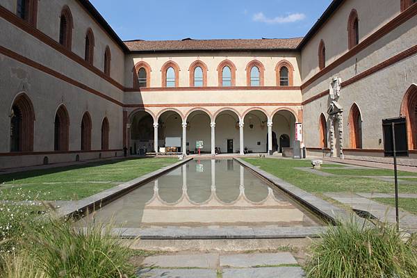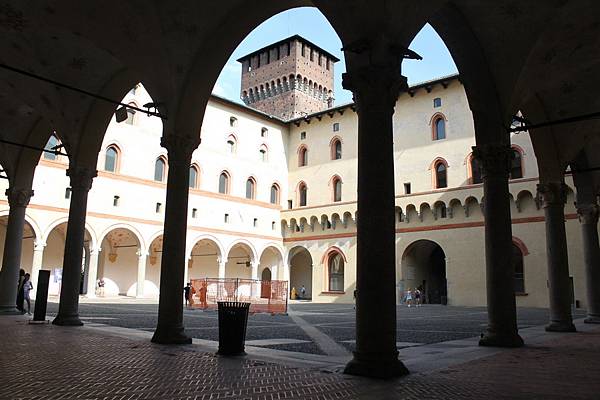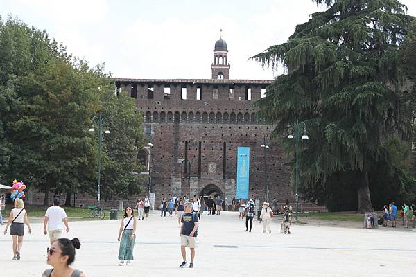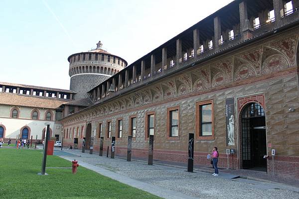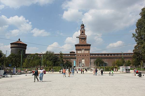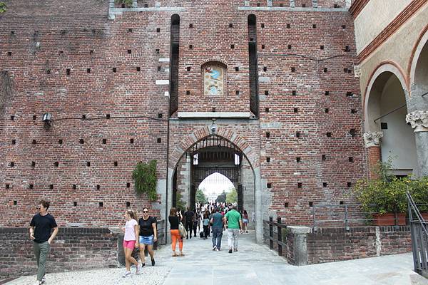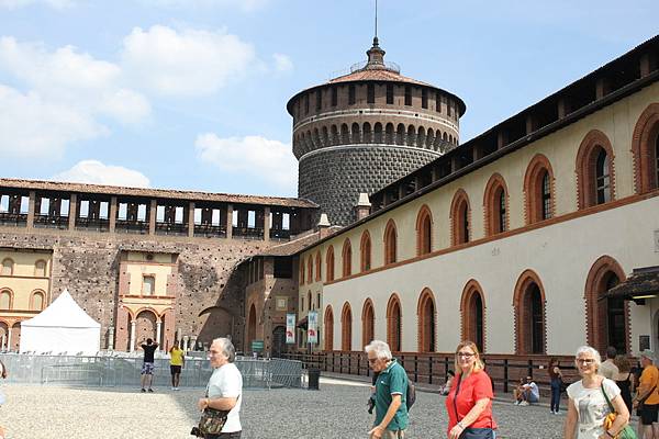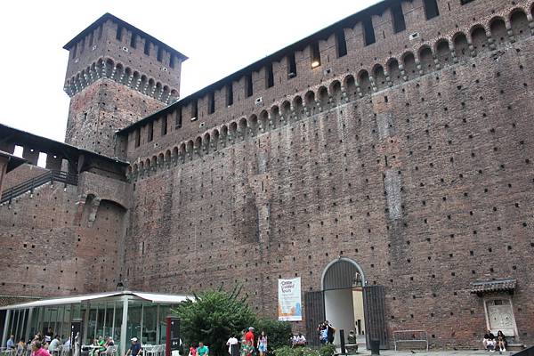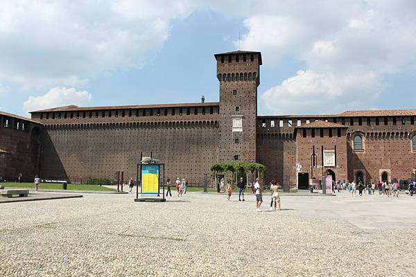從瑞士盧加諾拉車,越過阿爾卑斯山來到義大利—米蘭,遊覽車停在米蘭大教堂附近。領隊先帶大家到拿破崙大街,然後回到艾曼紐二世迴廊,在史卡拉廣場解散,自由活動為5小時。團員可利用時間參觀米蘭大教堂,或是去血拼。因為2011年來過米蘭,大教堂與屋頂都參觀過,況且排隊的遊客甚多,不想浪費時間。至於血拼,自認與時尚無緣,不如另做打算。因此決定到未曾去過的「斯福爾扎城堡」參觀,步行約14分鐘,參觀城堡、花園免費,但內部設立的幾處博物館是收費的。